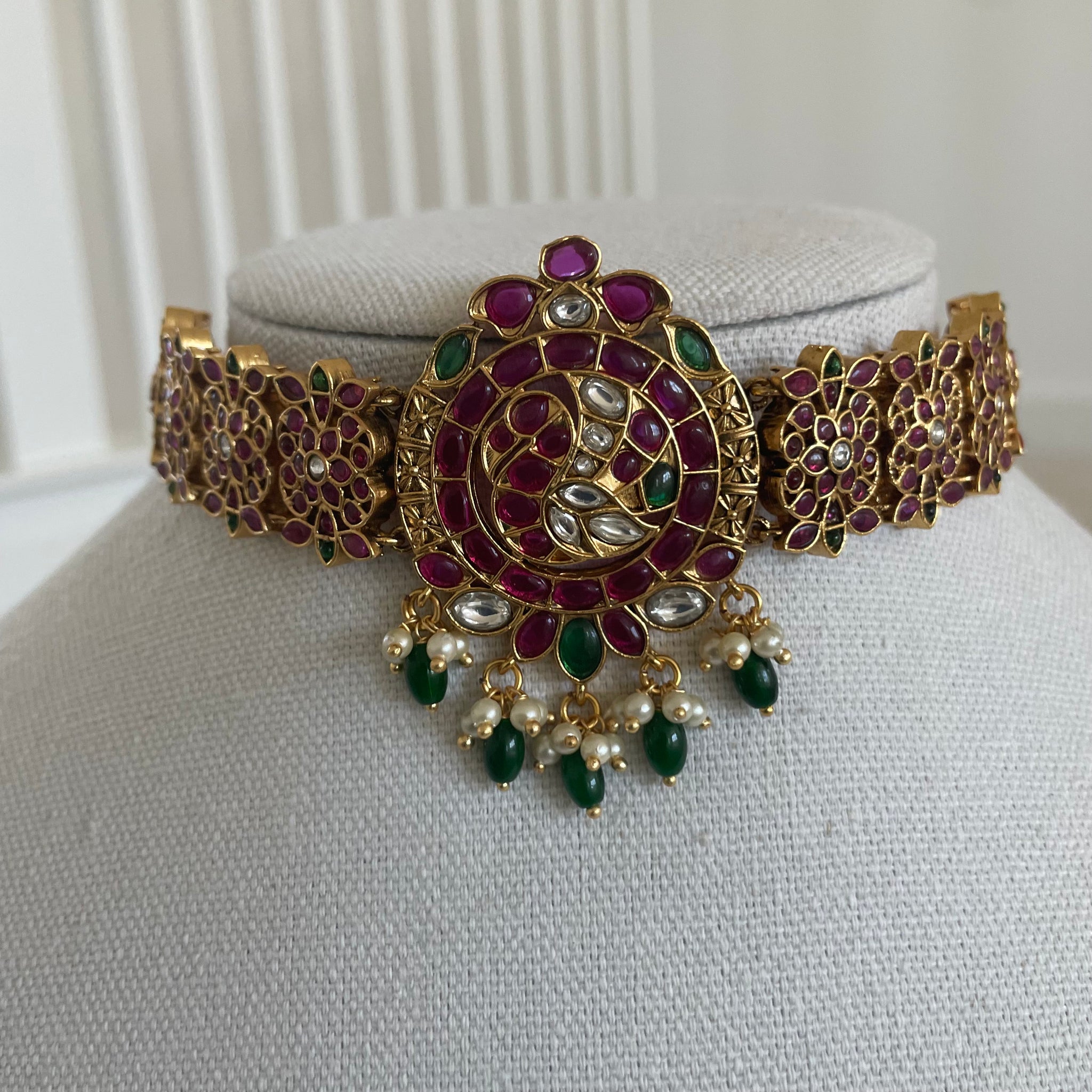 The peacock embossed necklace with beautiful kemp stones has pearl and green bead tassels is a perfect festive accesosr