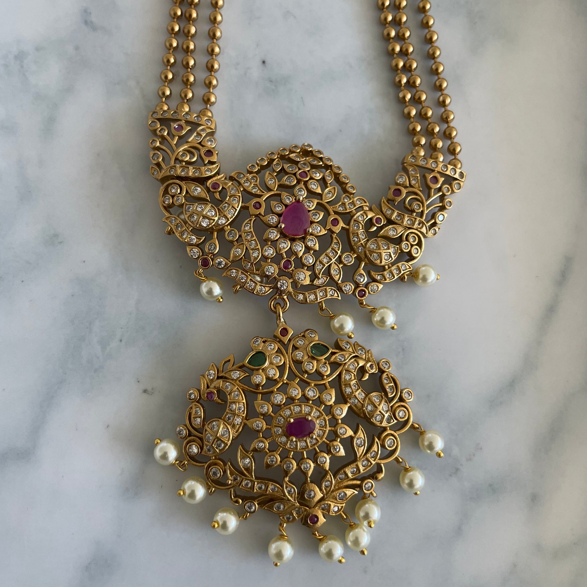 The “2/3 vadam” chain patterns are part of the traditional designs in South Indian jewelry and this is one such timeless piece with beautiful earrings . They are sure to accentuate your silk outfits for any occasion.