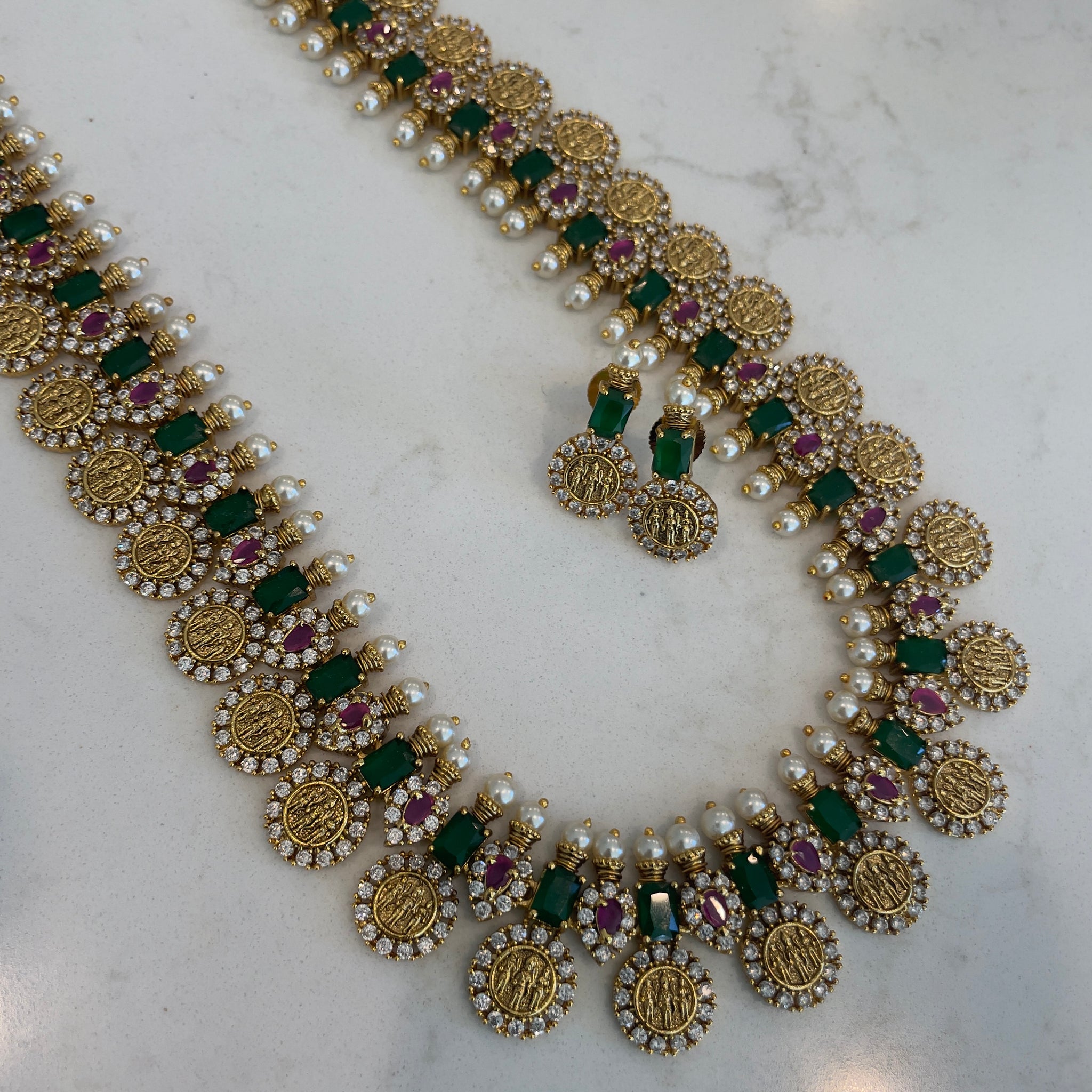 This timeless coin necklace will never go out of style.The sparking white stones and alternating pink and green stoneswith pearls makes it a. very loved piece.