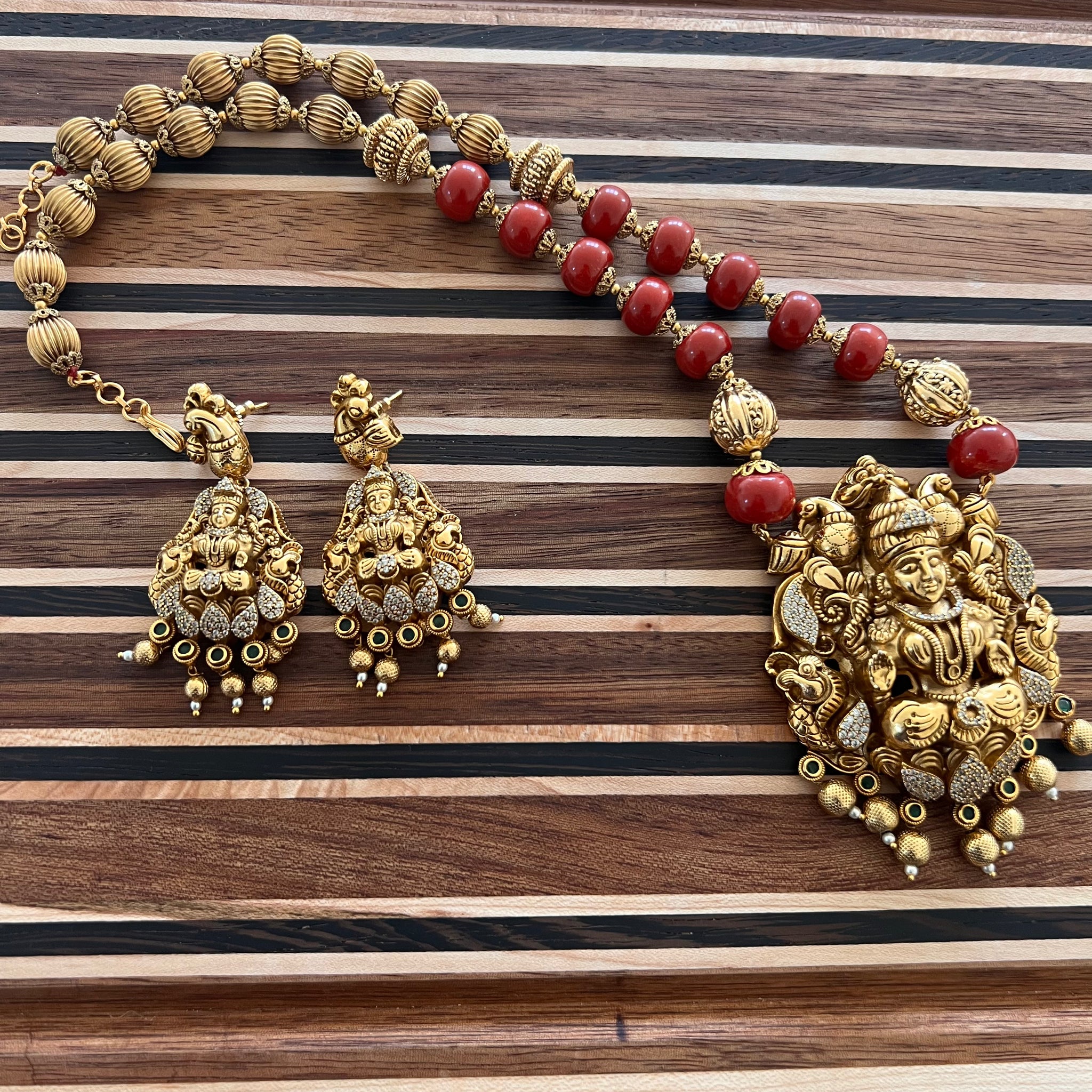 Handmade Red-Gold Beaded Nakshi Pendant Necklace