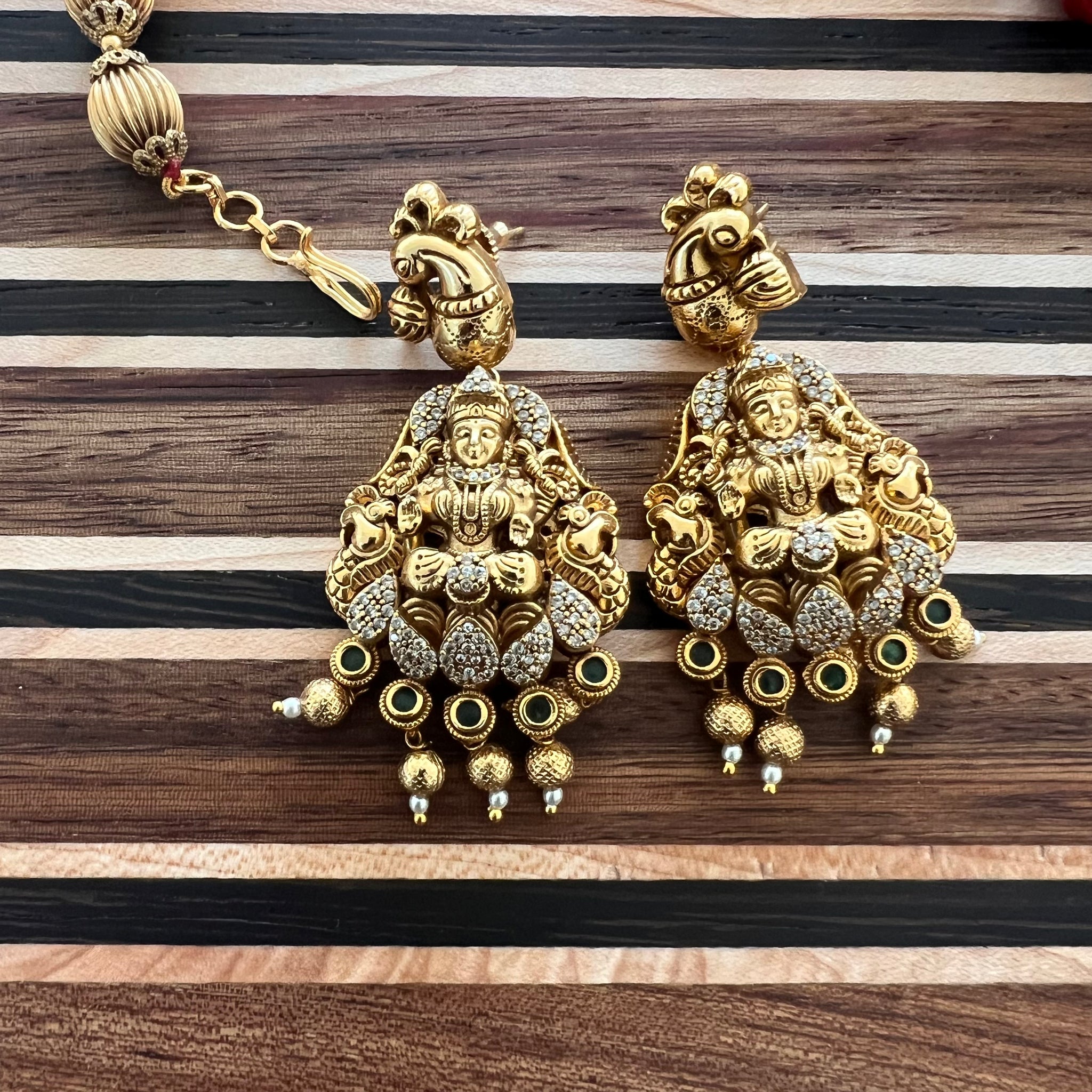 This Red and gold Nakshi beaded necklace is a perfect jewel which can accessorize your ethnic outfits bringing in the ancient temple carvings as designs in your jewel.These are heavier than regular designs but that is because of the solid metal used in carvings and it definitely adds to the grandeur.