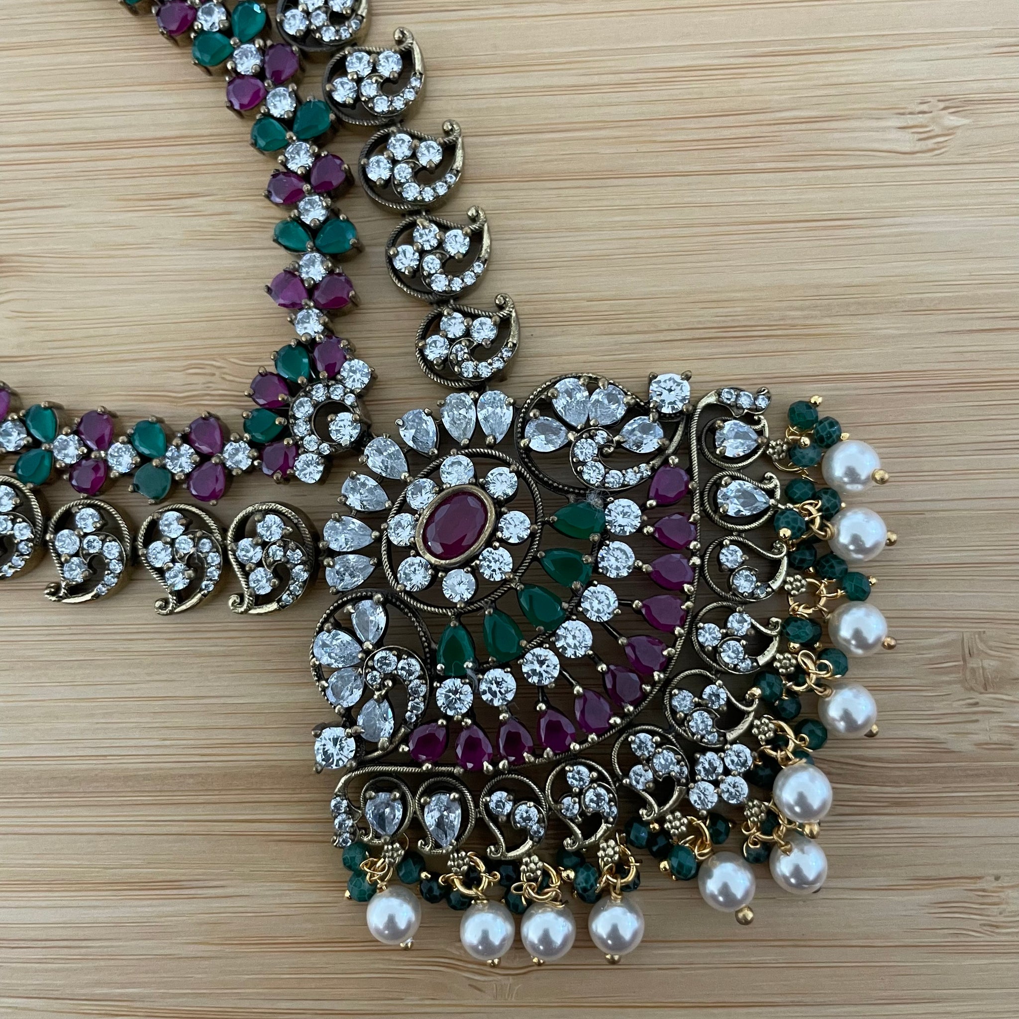 The smoky Victorian finish two layered necklace with pink and green stones will compliment your silks and satins perfectly 😊