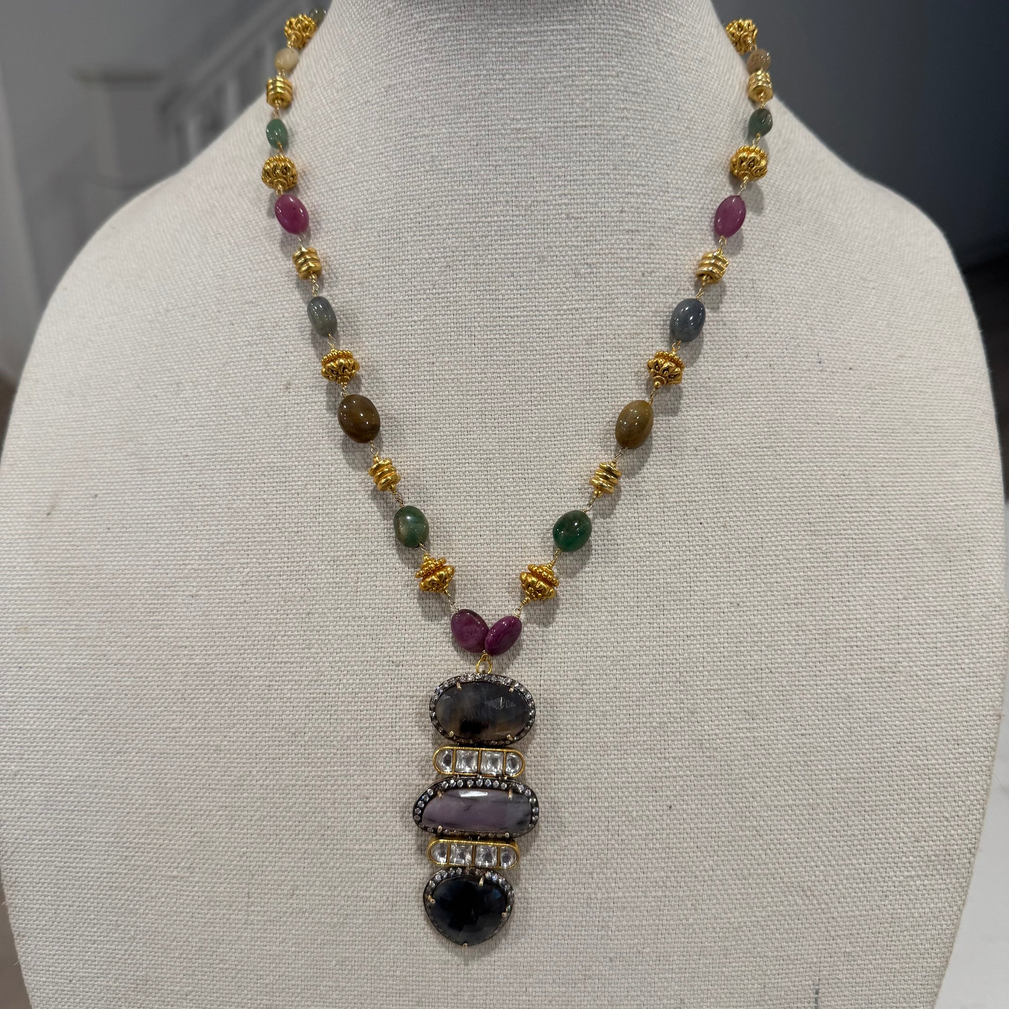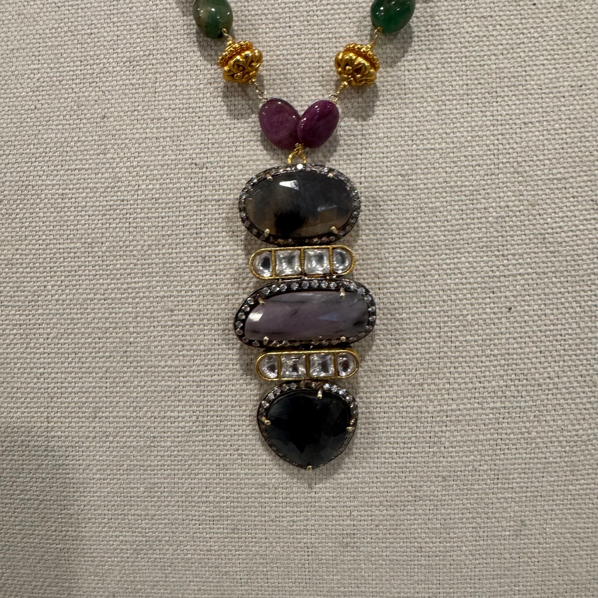 A gorgeous multi sapphire necklace kundan stones and sapphires strung with nakshi beads . Just ethereal.