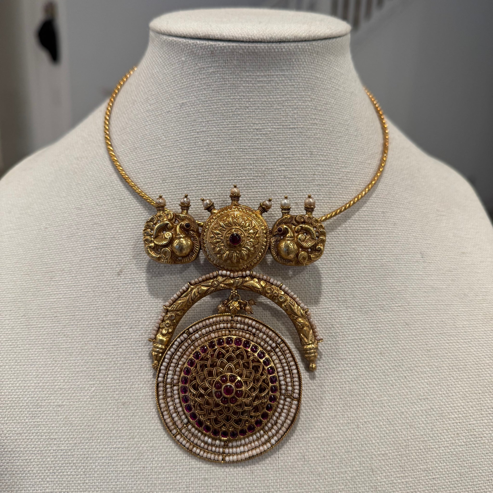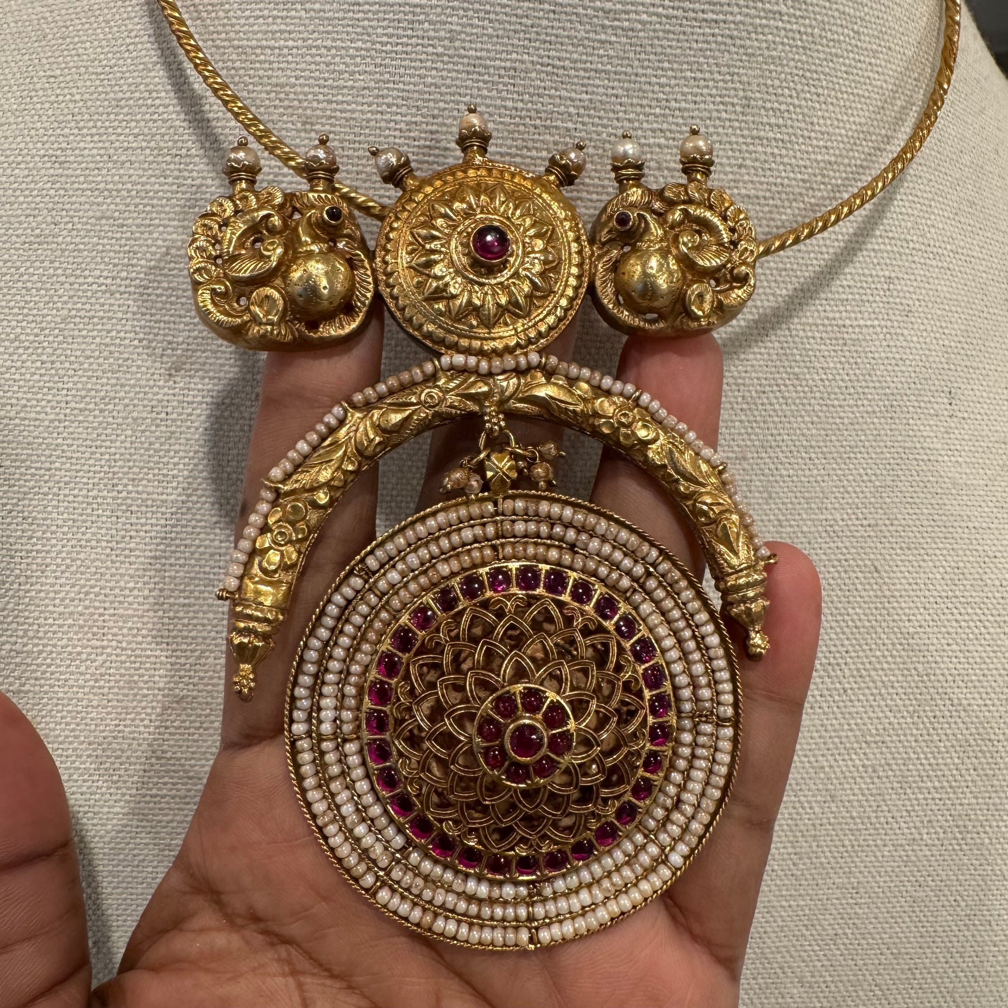 An antique temple necklace using the vintage nakshi elements of the past to create this beautiful fusion as a way of celebrating art and history.