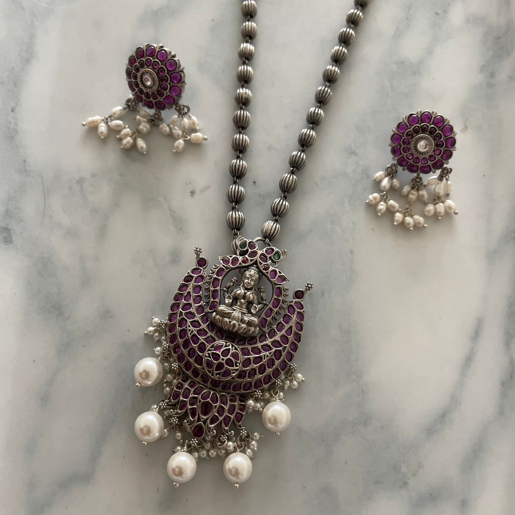 This patterned lakshmi pendant in crescent shape on lotus and pearl tassels will sure be your favorite accessory for your ethnic outfits . The intricately designed pendant with the perfectly matching earrings will surely make heads turn.
