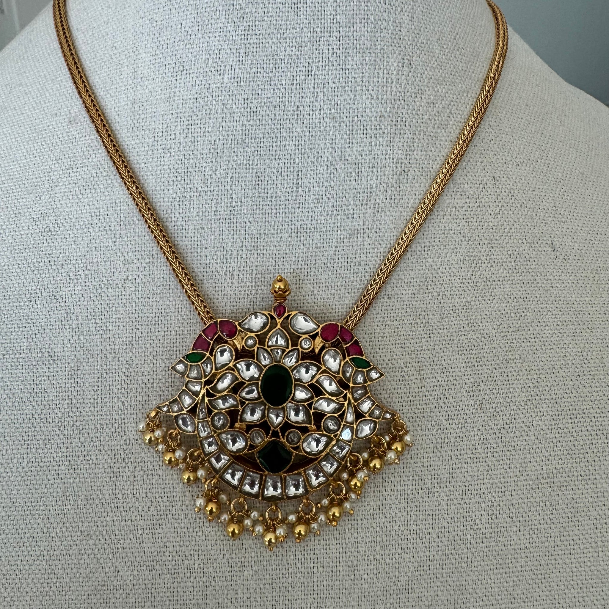 This simple and elegant necklace with Kundan Jadau pendant is a design inspired from our vintage designs. Here the center pendant is called the "Pathakkam" and what was created in diamond and gold has been created artistically in silver now.