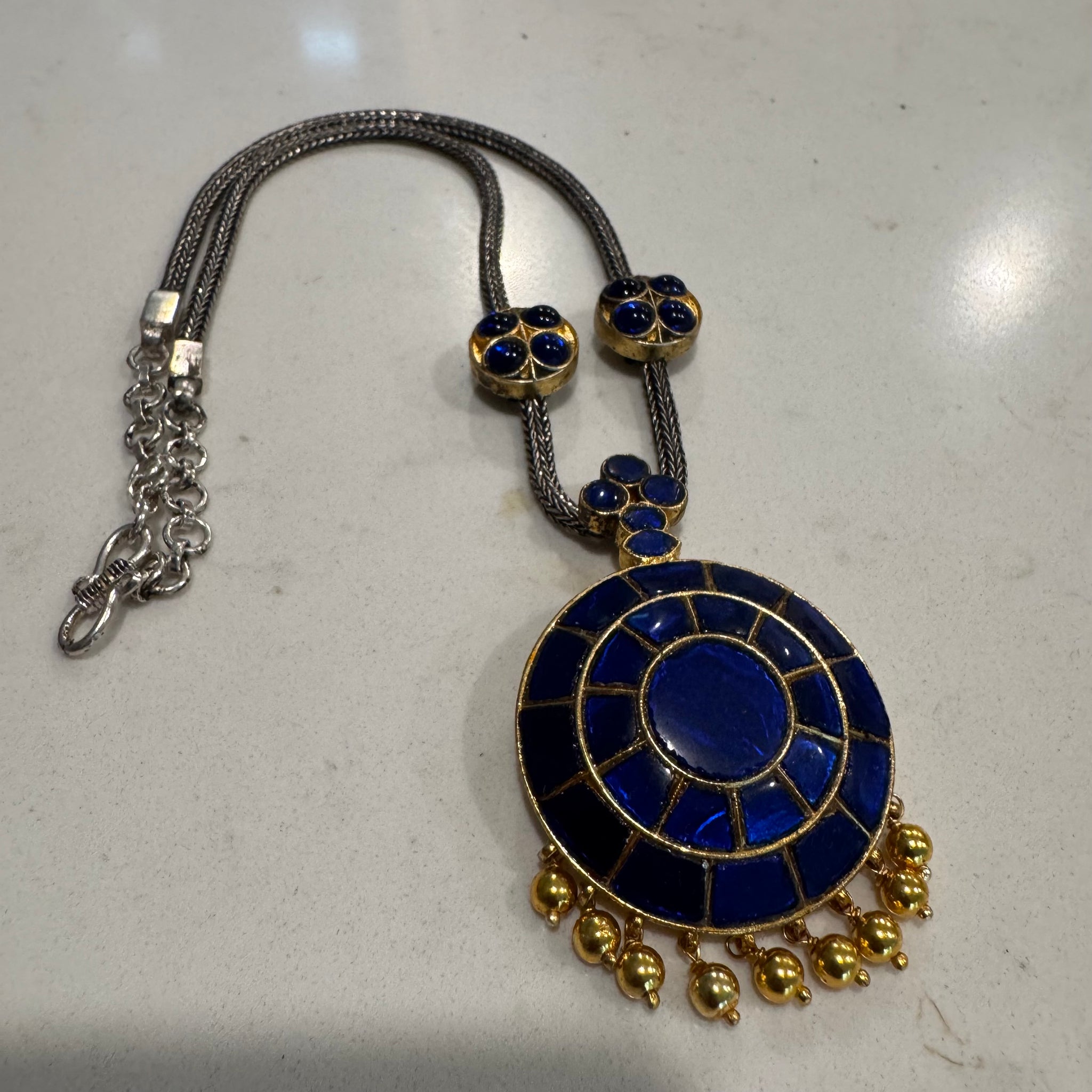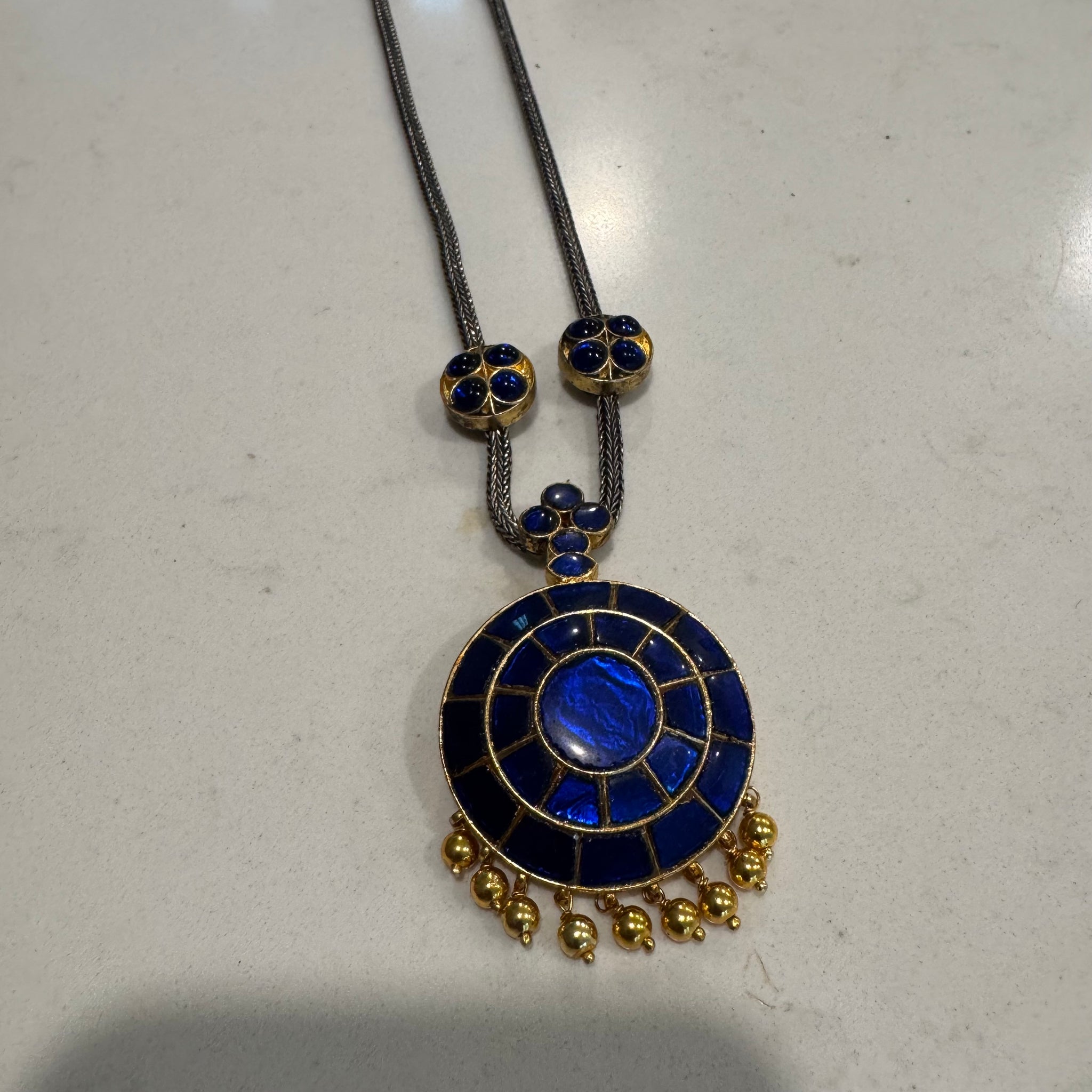 This simple and elegant necklace with Kundan Jadau pendant is a design inspired from our vintage designs. Here the center pendant is called the "Pathakkam" and what was created in emerald n ruby has been created artistically in blue now.