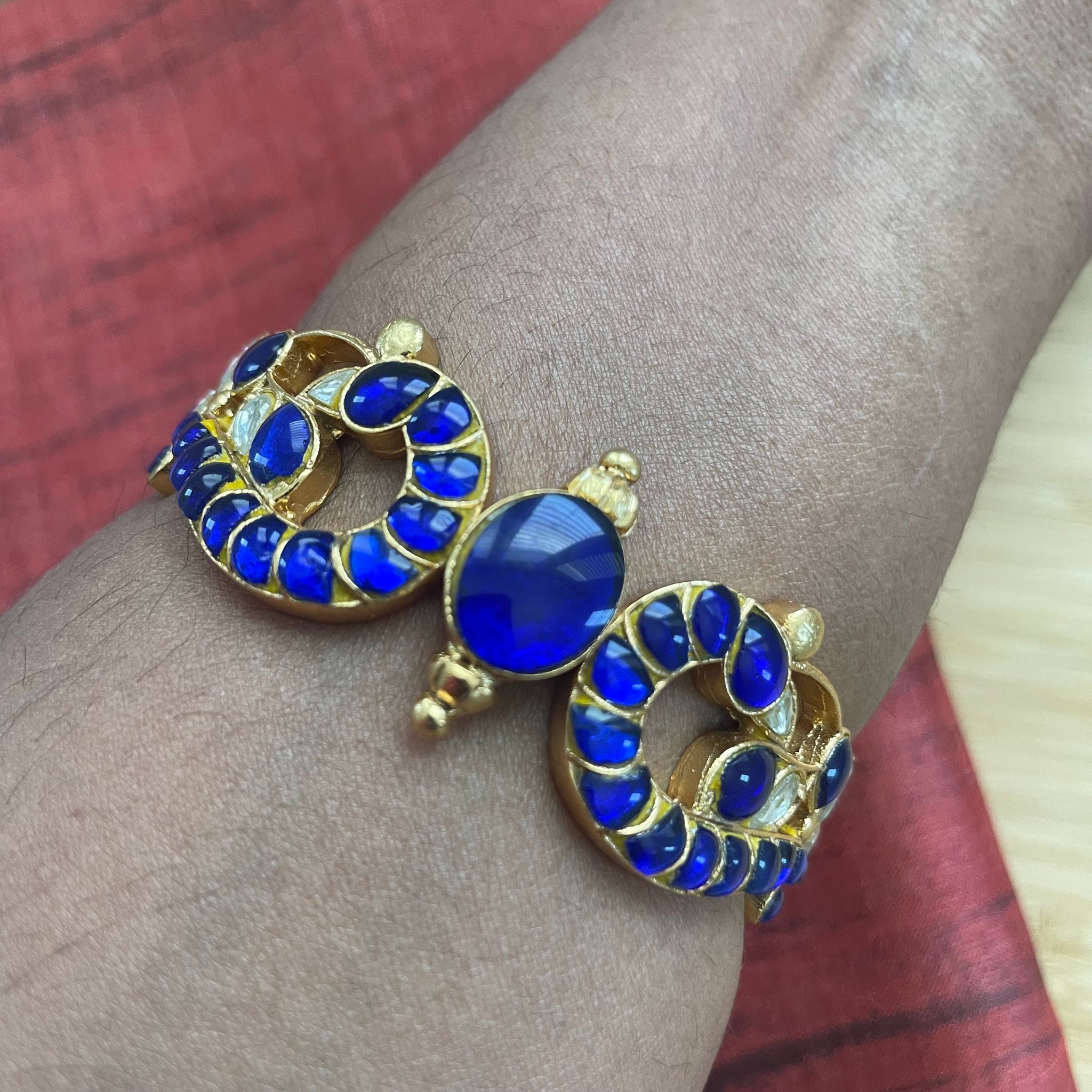 The Jadau Bangle with whire and blue stones is beautiful and depicts intricate craftmanship.