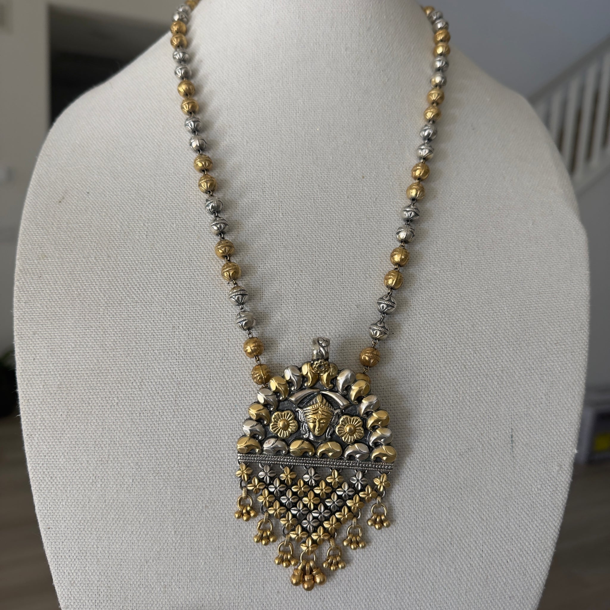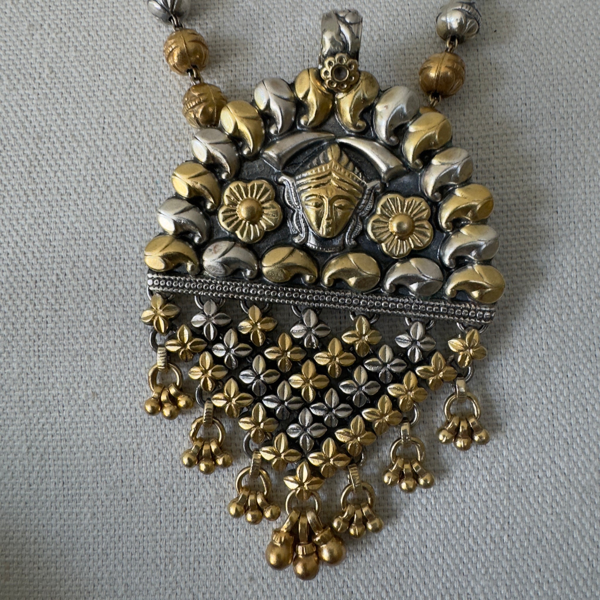 A two tone necklace with durga embossed in an old style pattern