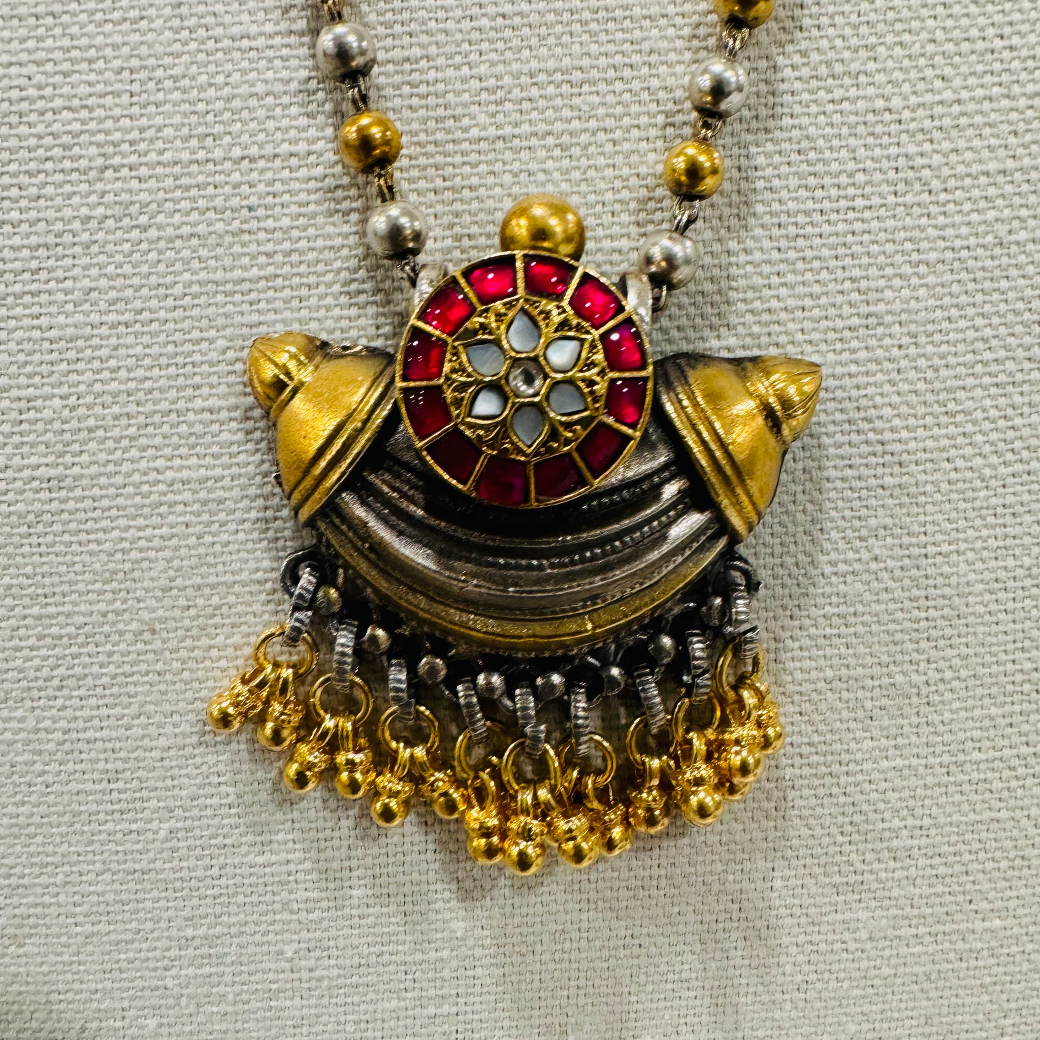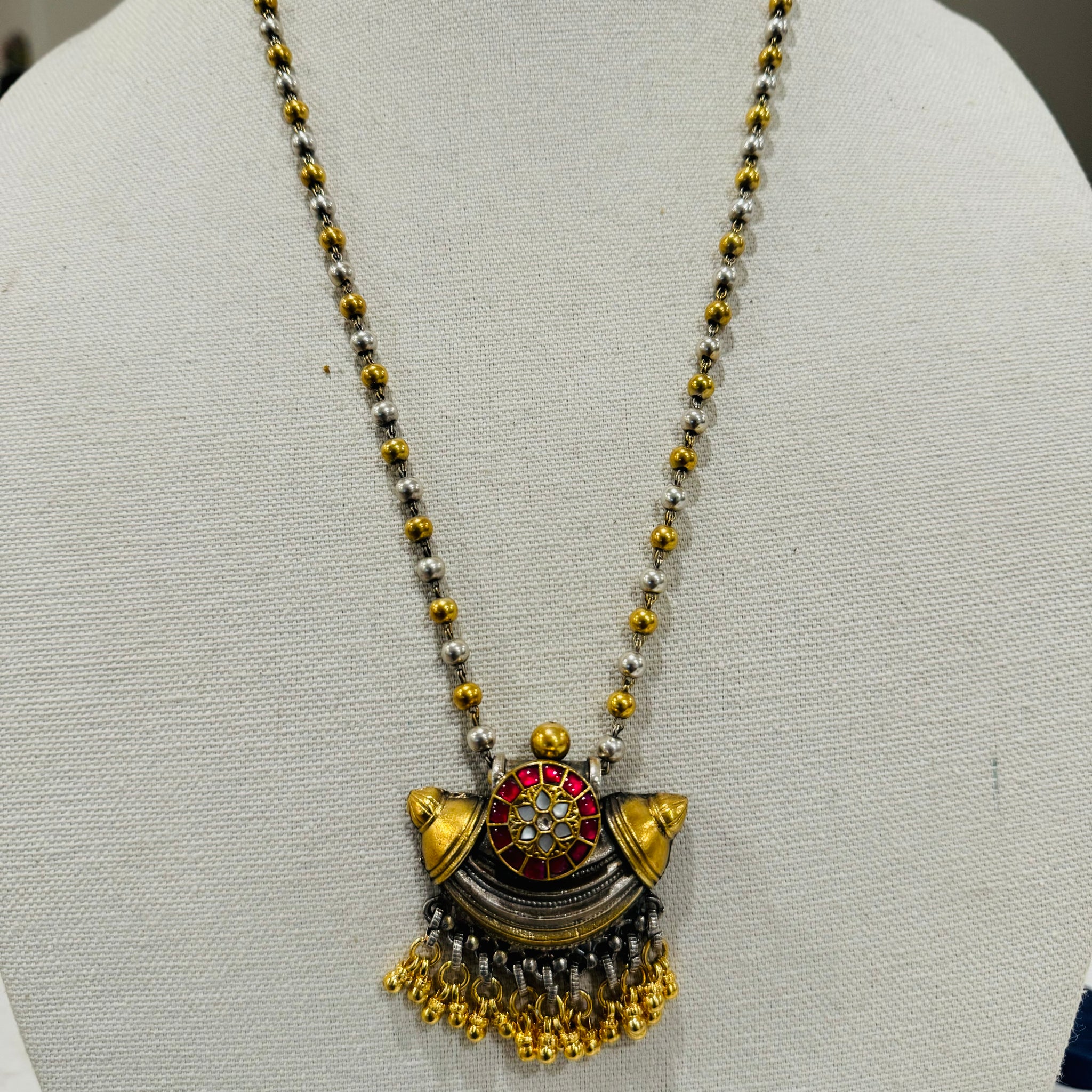 This two tone silver necklace with crescent shaped element , ghungroos and kundan stones are just gorgeous.